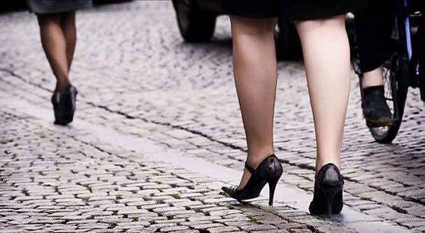 穿着高跟鞋的时尚达人很难在鹅卵石街道和金属格子站台上行走。穿着高跟鞋的女孩们在拉各斯市中心的鹅卵石小路上度过了一段艰难的时光。