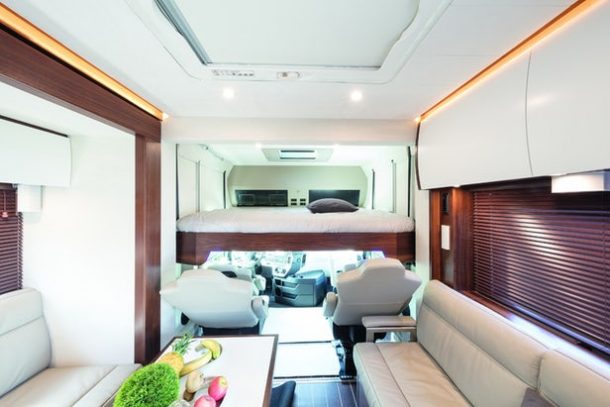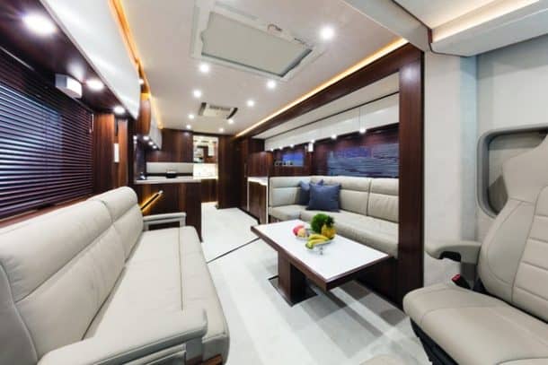 就在驾驶室后面,有一个开放式的起居区,旁边是厨房和小餐厅。卧室和浴室位于后面,气动滑梯可进入生活区。可选配空调、地暖系统和柴油热水器,但包括标准燃气供暖和热水。高达420瓦的太阳能电池板、柴油发电机或燃料电池,以及500升的淡水罐都是标准可用的系统。