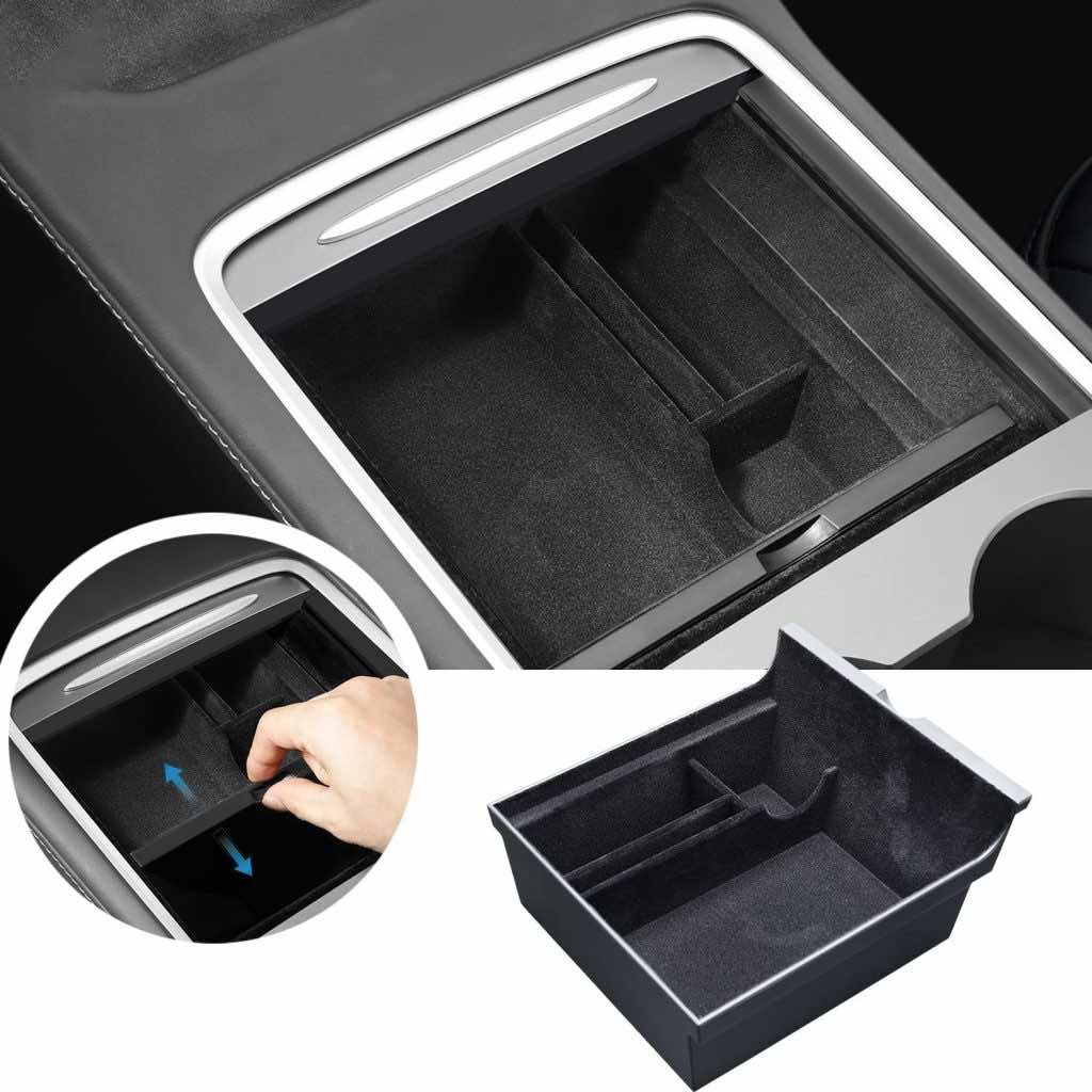 控制台组织者为模型3 Y可以幻灯片顺利推和拉中心控制台组织者托盘方便地访问上下存储隔间,使一个清晰的视图检查项目,并避免隐私泄露。它很容易使用。在开车没有滑动。
