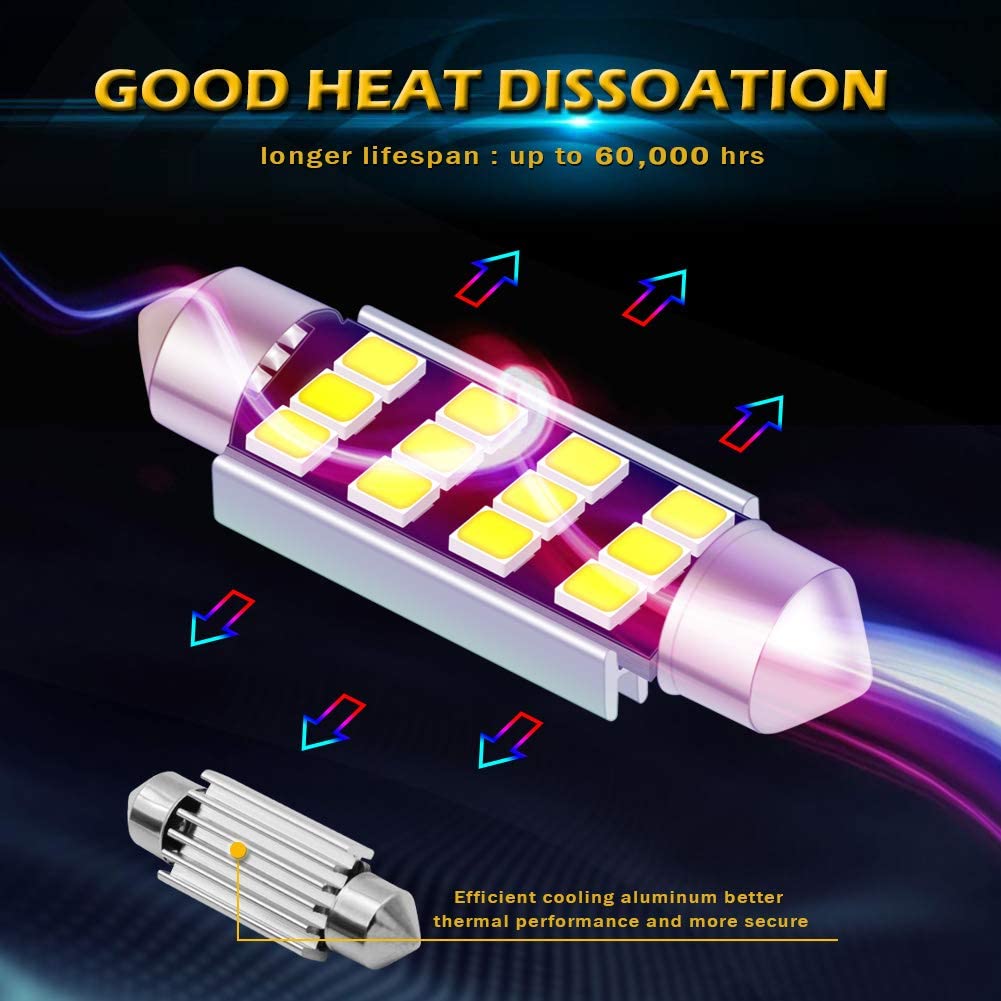 这些规格包括颜色:10000k蓝色。Volts:12V DC具有内置电流电阻,无紫外线或IR辐射,非极性;交叉参考编号:211、212、211-2、212-2、214-2、560、569、578、6413、6429等。长度:42mm 41mm。