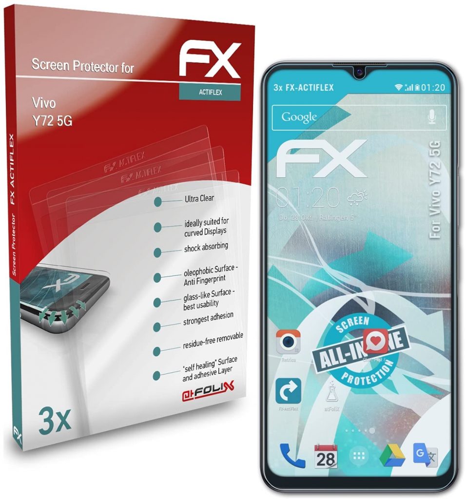 Vivo Y72 5G的下一个选择是atFoliX屏幕保护膜。外壳表面有涂层,使其非常牢固和光滑。它可以减少汗渍造成的指纹和油渍。它提供了99%的高清清晰度显示。圆形边缘提供最大的保护。镜片部分覆盖了一层厚层,这样它就不会在摔倒时受损。它是快速的触摸响应和保护设备从划痕和污迹。这种材料非常坚固耐用。