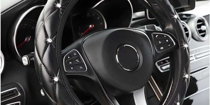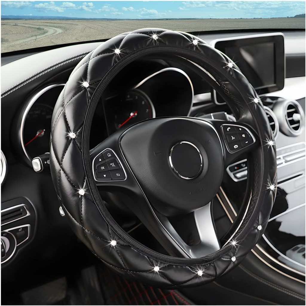 柔软的皮革上镶嵌着许多闪闪发光的钻石。它是经典与时尚的结合,绗缝的设计让它看起来更加优雅和精致。它不仅在灯光下闪闪发光,还能保护你的方向盘不受磨损。