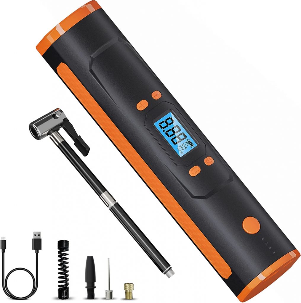Airmoto气泵包装120 PSI输出,易于存储在你的口袋,背包,或汽车在1.2磅和6″长。充电线是USB-C型,便于随时充电。