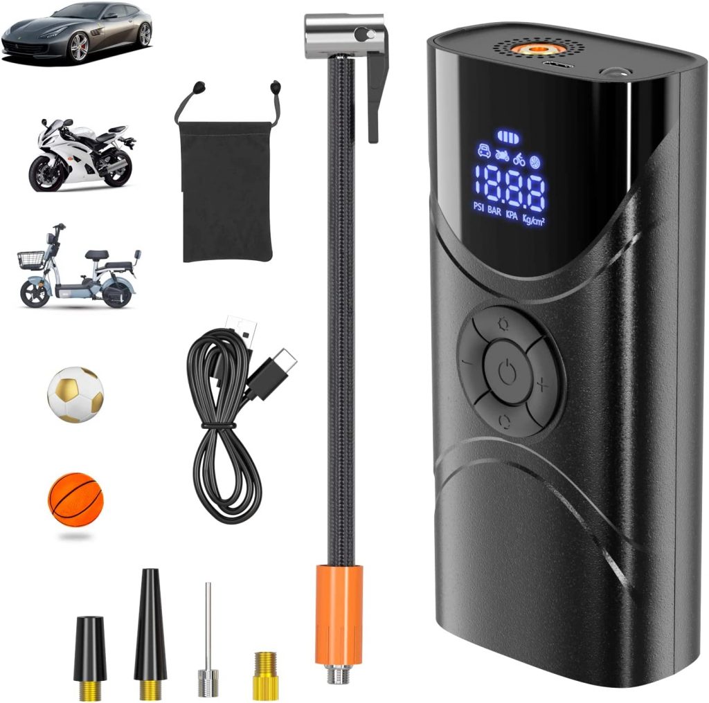 这轮胎充便携式设备是由一个强大的汽车的日常泵需要的解决方案。其设计有散热孔,以防止经济过热。它有多个附件,c型电缆,和用户手册。