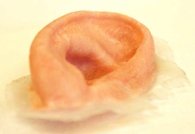 形成外耳的可见的大皮瓣叫做耳廓.它们的主要成分是软骨。科学家们想出了在3D打印机的帮助下打印耳朵的主意。他们使用了能够产生胶原蛋白的老鼠和牛的细胞。它们必须被放入3D打印机制作的人耳模型中。制作这样一只耳朵只需要不到一个小时的时间。