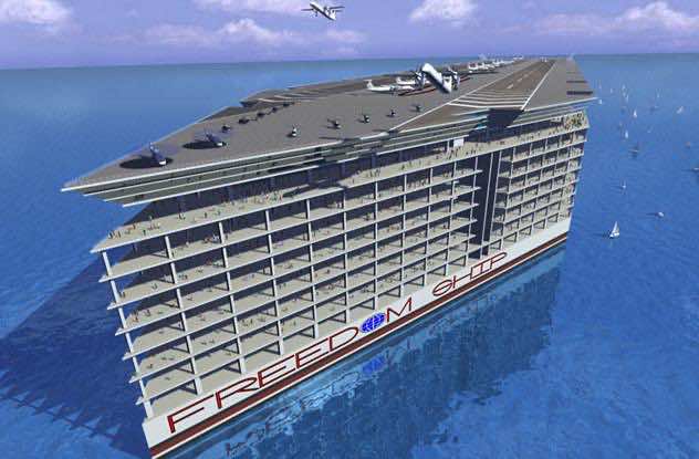 这个想法早在上世纪90年代就提出了,它是一个漂浮的自给自足的城市,将在两年内横跨全球。“自由之船”的设计目标是容纳5万人,拥有自己的经济、工作、学校、商店和传统城市所拥有的一切。但它没有成功,因为没有多少人愿意完全把自己的生活搬到一艘可能成为下一艘泰坦尼克号的船上。世界上的事情都是这样,人们在这么拥挤的地方怎么能和平相处,而他们却在户外战斗。