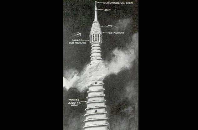 这座700米高的塔被提议于1937年安装在巴黎,就像一个汽车理发杆。塔的顶部将是一家酒店,人们可以沿着一条环绕塔的螺旋状道路开车到达。顶部将安装一个可停放400辆汽车的停车场,在车库和酒店之间将有一个餐厅。单轨系统会将车厢慢慢地沉入海底。这座建筑太疯狂了,幸运的是它从未完工。