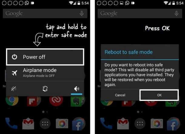 您的正常电话操作有时可能会被第三方应用程序中断,因此您可以通过启用安全模式来调试电话。打开你的手机,再次按下电源键并按住一会儿。一个菜单将出现,你按下并按住“电源关闭”键,之后安全模式选项将出现。