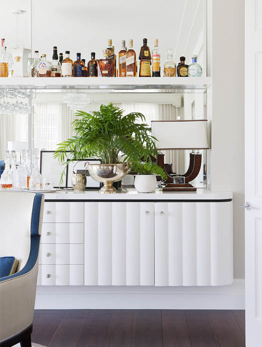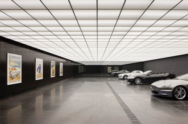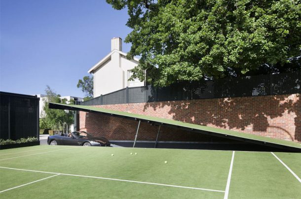 这座经典住宅的现代车库在网球场旁边有一个秘密入口,该入口被球场的一部分覆盖,可以让汽车进入车库。一旦汽车在里面,液压盖降低回来。车库天花板上的LED灯可以被设置为高亮每一辆车。镜面的真墙和led灯给人一种无尽空间的错觉。楼梯垂直连接地下室和房子。