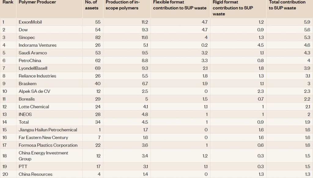 前20名的公司遍布世界各地。其中11家在亚洲,4家在欧洲,3家在北美,1家在拉丁美洲,1家在中东。所有这些公司生产的一次性塑料主要由化石燃料制成,因此这一过程的副产品进一步将气候状况推向了边缘。