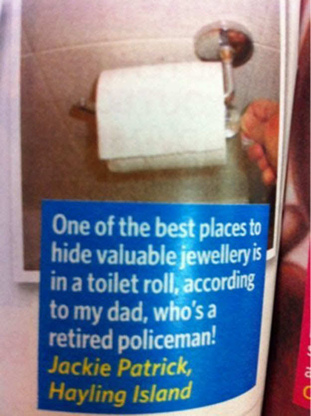 把你珍贵的东西藏在别人想不到的地方。例如,把你的珠宝藏在卫生纸筒里。