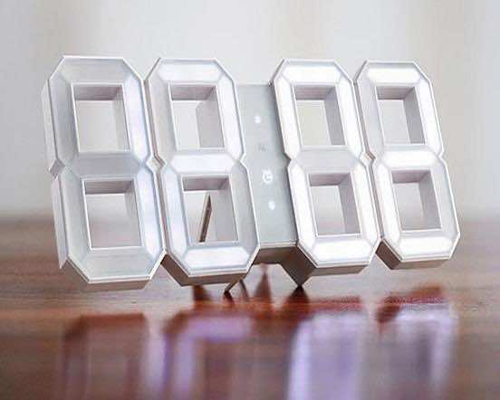 This 3D interpretation of the traditional digital clock, tells only the time and nothing else. It features an alarm and a light sensor that changes the intensity of the display depending on the surrounding light. You can get onehere