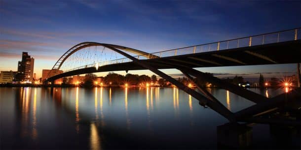 这座桥位于阿尔萨斯南部的Huningue,靠近法国、德国和瑞士三国交界处。这座桥横跨莱茵河,连接法国和德国。虽然这座桥不直接连接瑞士,但如果你在德国一侧,你可以很容易地到达那里。从桥的顶端,你可以欣赏到这三个国家令人惊叹的景色。