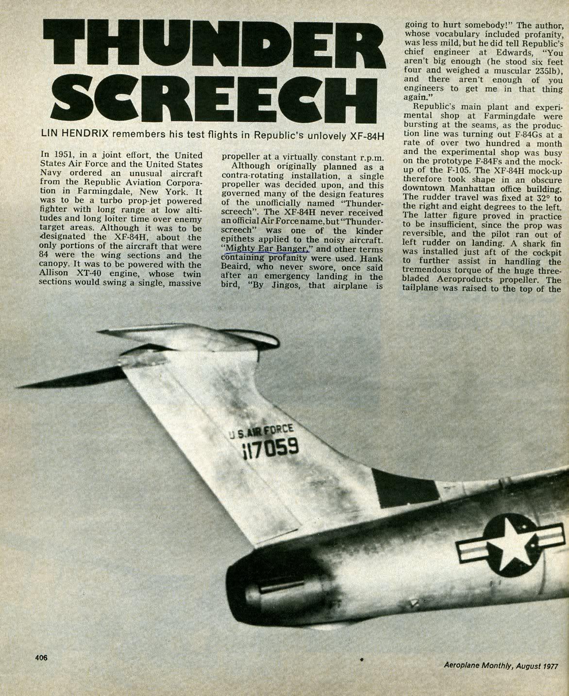 XF-84H的实验性涡轮螺旋桨飞机是由与超音速螺旋桨配对的涡轮发动机提供动力的。但是,由于飞机使用其发动机创造的噪音,该发动机在启动时可以听到25英里的声音,并引起了严重的恶心,并吹出了地面船员的耳膜,导致了它的取消。