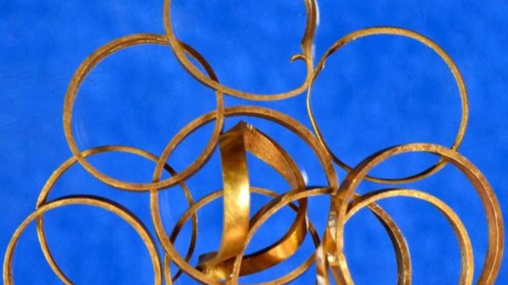 在罗马尼亚考古学家发现了一个非凡的缓存的古老的金戒指,一个6500岁的女人穿在她的头发。