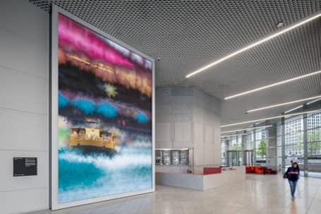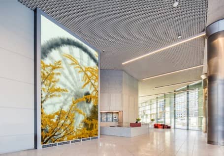 ESI设计由515 State Street建筑芝加哥委托,使该建筑的大厅具有温暖而私密的外观,可以吸引其游客和新租户。这个巨大的艺术作品背后的艺术家是一种算法。设计团队决定通过现代美术馆填补这个大厅的空间,并安装了7米高的显示屏。屏幕显示本地区域的不同视频,然后该软件以印象派风格绘制这些图像。它继续绘画,直到场景无法识别,并且在下一个场景之前就可以看到。该过程不断重复一次。