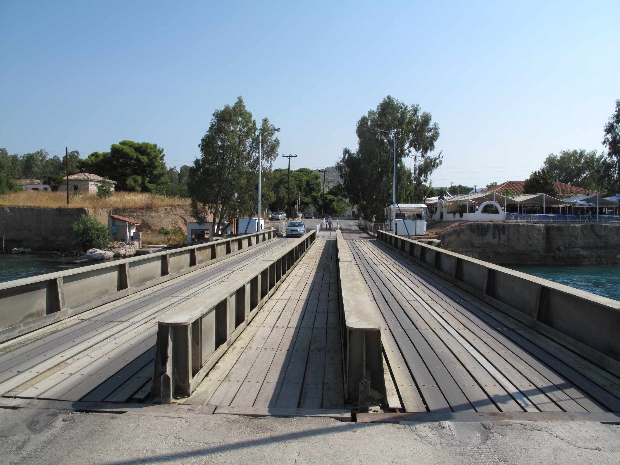在地峡和科林斯,在整个科林斯运河上建造了两座潜水桥梁,1988年两端。桥甲板在水位以下8米处降低,以使水上交通运输使用水路。