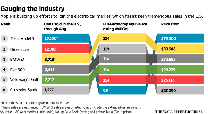 此外,考虑到目前电动汽车市场的性质,该公司设定的目标是相当雄心勃勃的。虽然已经推出了几款令人愉快的车型,同时吸引了买家和排放活动家,但它们过高的价格意味着它们只得到了政府的不冷不热的回应。苹果的汽车肯定会相当昂贵,甚至可能比特斯拉Model S本身还要贵。以下是汽车公司及其电动车型目前的销售数据: