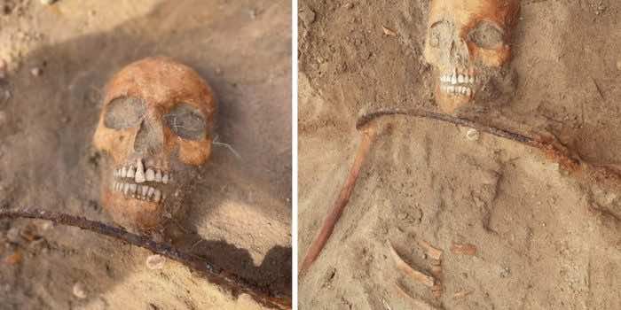 据报道,尼古拉斯哥白尼大学的一组考古学家最近发现了一具“女吸血鬼”的遗骸,这是一件令人着迷的病态事件。考古队在进行考古挖掘的例行任务时,偶然发现了这具骷髅,它也以“吸血鬼”而臭名昭著。这个可怕的吸血鬼在17世纪的波兰墓地被发现,她头上戴着一顶丝绸帽子,还有一颗被戳破的牙齿。最有趣的一件事是,她的脖子上挂着一把镰刀,如下图所示: