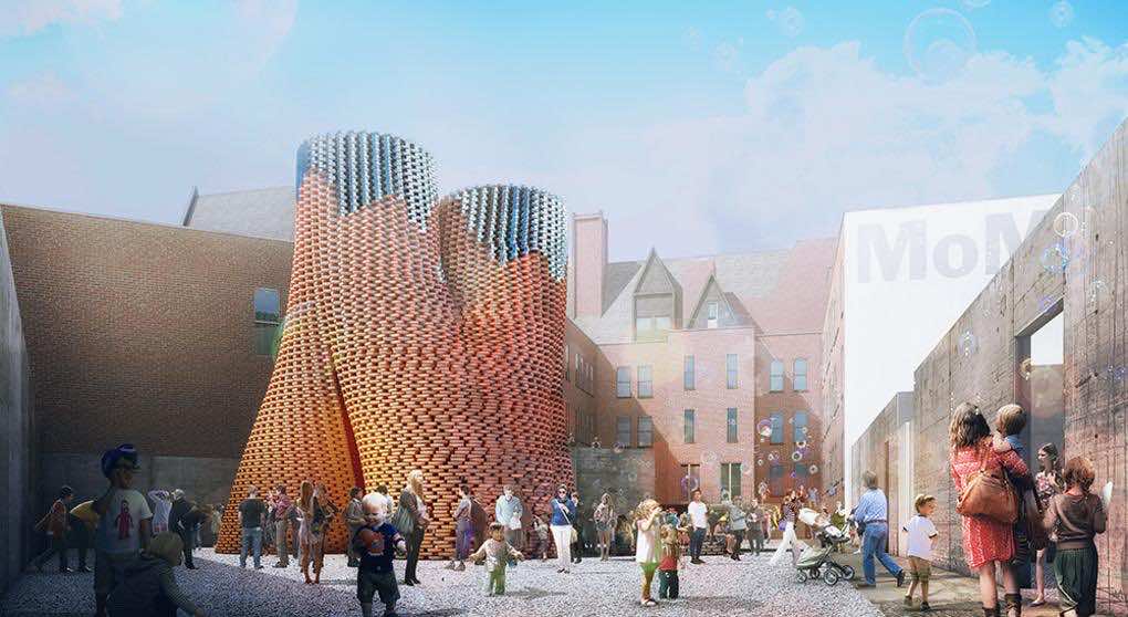 现在要回答的问题是,在成为结构的一部分后,如何让阳光照射到应该生长的块体;反光砖!是的,这些奇特的砖块将被用来为有机街区提供照明。该建筑将位于现代艺术博物馆PS1。这里的基本想法是提出一个零废物产生的结构,将为游客提供座位空间和阴凉,而画廊将在夏天举办音乐会。