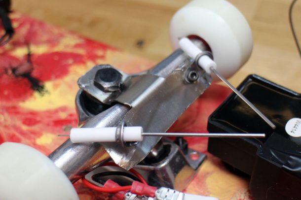 点火器有两个电极,距离足够近,电流可以在两个电极之间跳动。你可以把它们固定在板的下面,足够接近地面,它可以点燃燃料,在金属支架的帮助下。