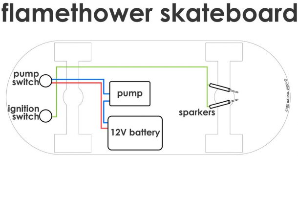 这些说明将教你如何通过按下按钮点燃一条燃烧的小径,在一个带小油箱的滑板上滑走。观看火焰喷射器使用的视频,如果这是你喜欢的东西,请继续阅读说明: