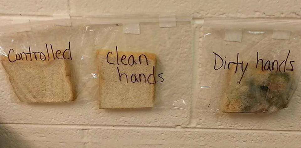 它是面包,必定会发霉。但是,受控的一个和用洗手的面包切片显示出很少的迹象。每个学生触摸的一个人都被模具完全覆盖,因为孩子的手已经滑过。