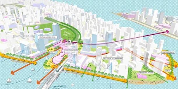 停车位的设计采取非常现代的方法和运输是地面,下面添加一个更加环境友好的城市。大量的建筑和基础设施计划在城市会非常复杂的实现,因为它需要非常稳定的土地。佐佐木的网站上显示了与岛边缘的细节设计,模拟自然的方式在该地区土地与水。