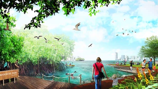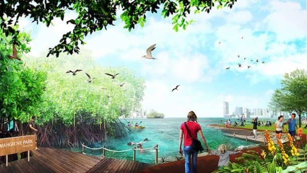 红树林,城市步道、海洋潮汐池和生态防波堤的边缘增加森林城市的奢华感觉。