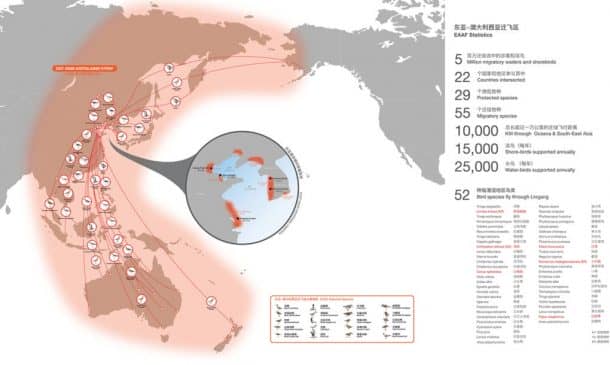 该设计将建在中国临港的一个垃圾填埋场上,这是一个湿地鸟类保护区,在东亚-澳大利亚飞行路线(EAAF)上,有超过5000万只来自南极的鸟类。由于沿海城市化,这条路线对鸟类来说已经变得不稳定,这是全球五分之一濒危水鸟迁徙的主要原因。