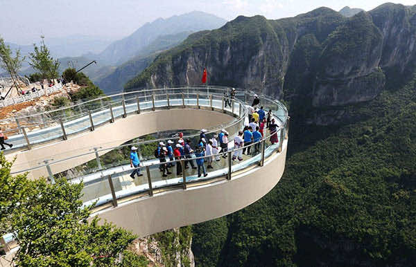 空中步道是一种吸引游客的创新方式,为他们提供了令人毛骨悚然的体验。它们是悬臂梁,只从一端悬挂,因此允许它们没有柱子或支撑悬浮物。从下面的玻璃路面上可以一览无遗。高空行走的效果是如此真实,恐高症患者根本无法在空中行走。它是由中国政府建造的,以吸引更多的游客到国家公园。这项工程的费用估计约为560万元。