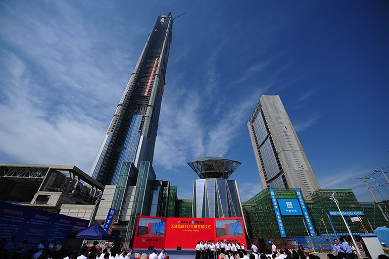Golding Finance 117 Towers由于其形状而被昵称为“拐杖”,并在天津的商业区建造。它仍在建设中,完成后,将有117层混合用途,但是,它已经达到了8米的最大高度597米。Th9月,从而在世界上最高的摩天大楼中确保了其位置。
