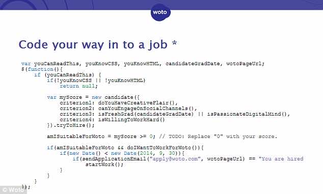 你们中有多少人见过第一个完全用代码写的招聘广告?这则广告来自一家名为Woto的公司,总部位于伦敦。显然,他们想要雇佣一个有创意的设计师,但如果他/她想要这份工作,上述的人还需要擅长编程。