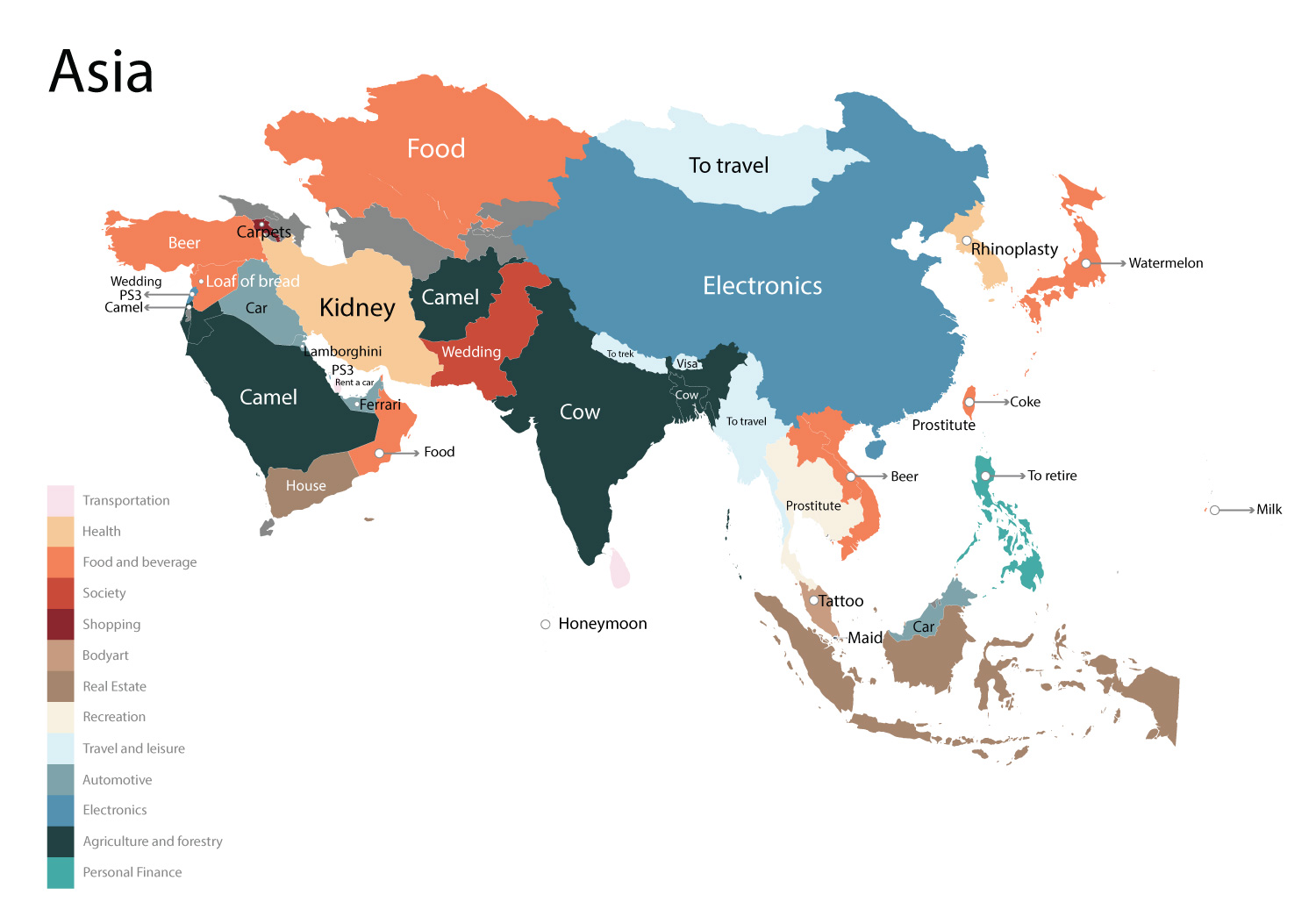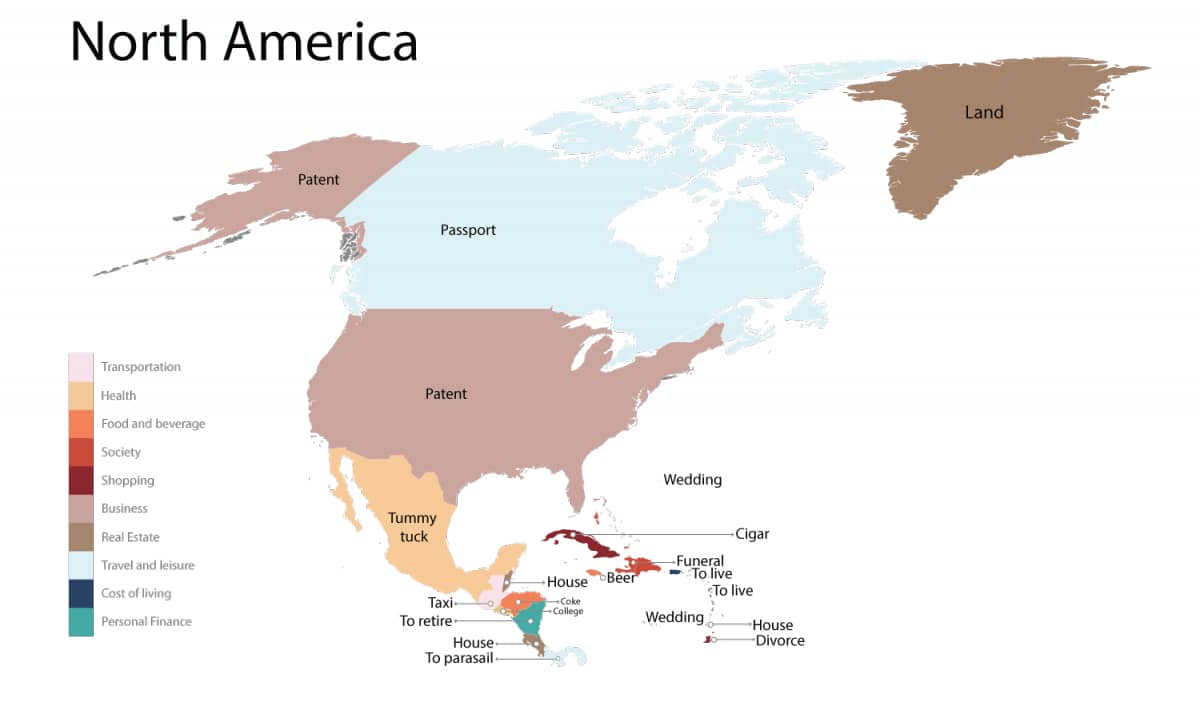 该网站制作了一张世界地图,展示了每个国家被谷歌搜索次数最多的产品。他们使用了一个简单的公式进行谷歌搜索:“*在[x国家]需要多少钱。”我们都知道谷歌搜索结果如何随着您的偏好、搜索时间、搜索地点和您自己的搜索历史而变化。尽管如此,它确实能让你很好地了解国际上对这个国家的看法。