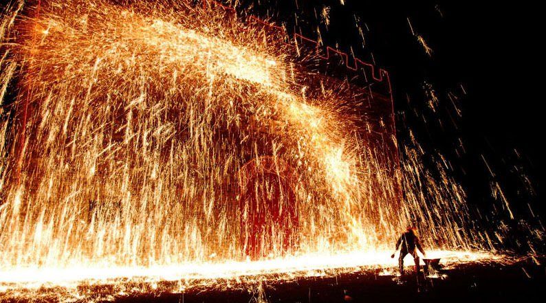虽然中国其他地区用传统的鞭炮和火箭庆祝农历新年,但北京东部的一个小村庄展示了一场演出,这与任何东西都不一样。敢于史密斯史密斯(Daredevil Smiths)将熔融的铁扔在墙上,形成了类似烟火的火花倾盆大雨。