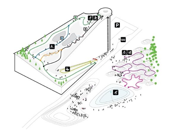 屋顶区域应重塑以形成1,500平方米的人造滑雪坡,并具有三个可以提供不同品种的跑步。95,000平方米建筑的外立面将配备绿色种植箱,以散发远处的绿色山脉。滑雪跑是一个更大的娱乐开发区的一部分,该区域将采用帆船,攀岩和卡丁车等活动。