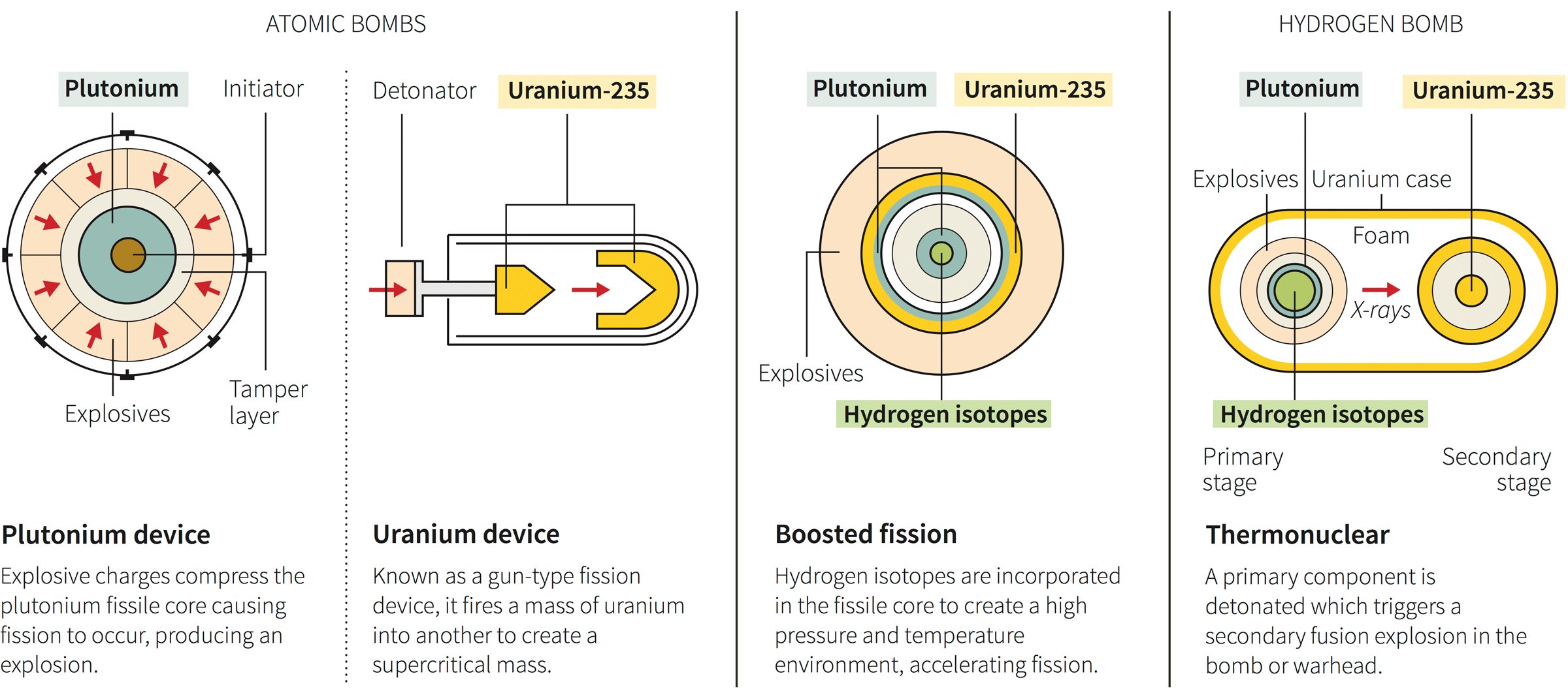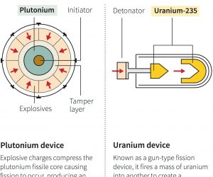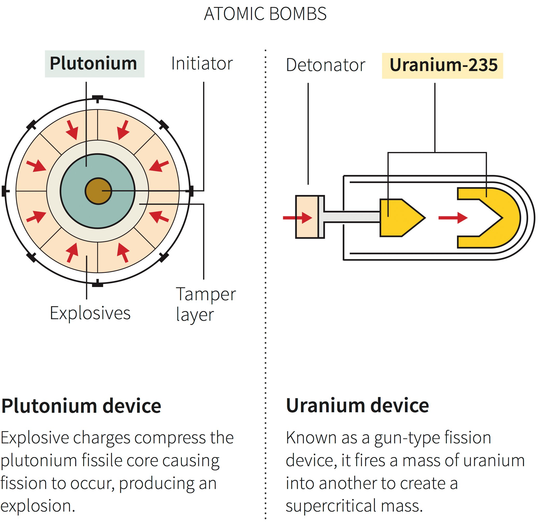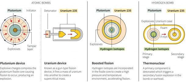 这样的炸弹有两种类型,一种是枪支,它以如此的力爆炸了富集的核材料,以至于引起核链反应。其他内爆型通过将空心球折叠在核材料的核心上,从而以更准确的效率和效率来实现核裂变。路透社的图像显示了两者的例证。有趣的是,胖子炸弹掉落在长崎是内爆的类型,而在广岛上引爆的小男孩是枪型。