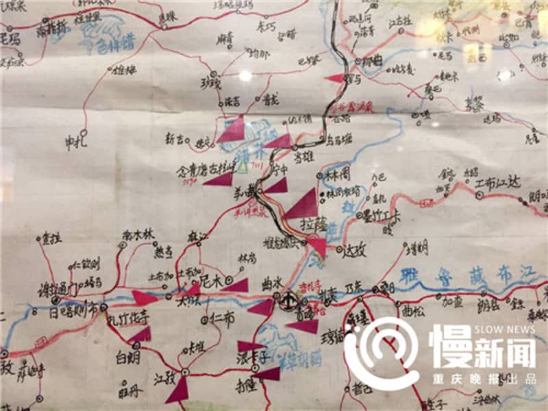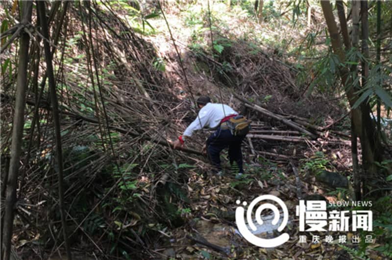 张在中国重庆市附近的富灵森林公园的一座山上铺设建筑材料,以使从现代道路到顶部的一个孤立村庄的数百米的安全步行道,从村庄到它的村庄水源。