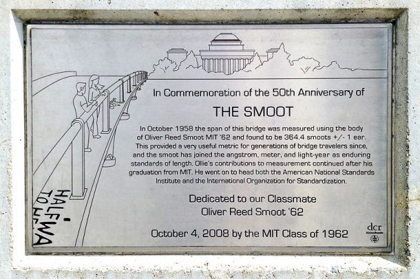 您可能以前没有听说过这个单元,因为它不在标准名单中,并且在几年前的书籍中被隐藏了。但它在1950年代后期在麻省理工学院拥有历史。它的名字来自奥利弗·R·斯莫特(Oliver R.在没有任何工具的情况下,他们不得不测量位于波士顿和剑桥之间的哈佛桥的整个长度。不过,他并不孤单,他可以从课堂上获得帮助。那是恶作剧,但导致了Smoot的起源!