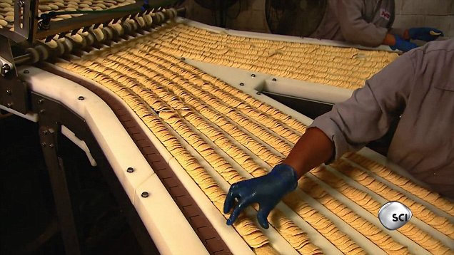 然后,这些芯片在传送带上向前移动,并将其压在模具上以使它们具有标志性的形状。这些模制碎片然后通过沸腾的油移动,然后炸了几秒钟。