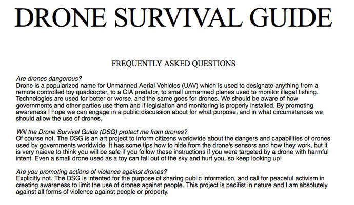 尽管该指南的目的是作为艺术,它包括详细的技巧指导由基地组织的打击无人机在2013年出版。这些技巧包括隐藏一个浓密的树荫下树,使用空间毯子隐藏热量信号,将玻璃车顶反射光线。佩特说,导游是印在铝纸使它“一个有用的工具干扰无人机传感器”。