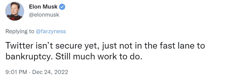 特斯拉首席执行官兼推特总裁埃隆·马斯克表示,这家社交媒体巨头不再“走在破产的快车道上”。不过,这位亿万富翁强调,在这个平台上还有很多工作要做。但总的来说,事情似乎正在朝着正确的方向发展。