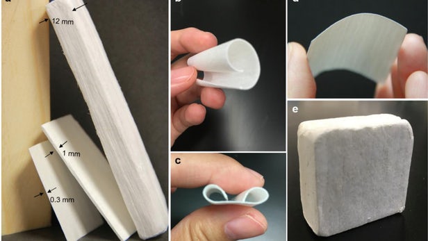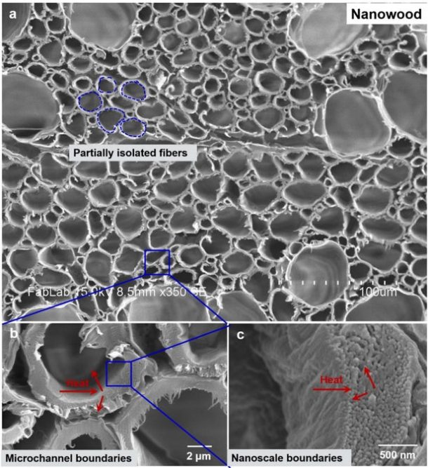 当木质素的块木头,你只剩下一个轻量级的,白色的纤维素纤维束。这些纤维作为有效的绝缘体和更好地阻止热量比硅基材料。他们也有各向异性属性费管状。