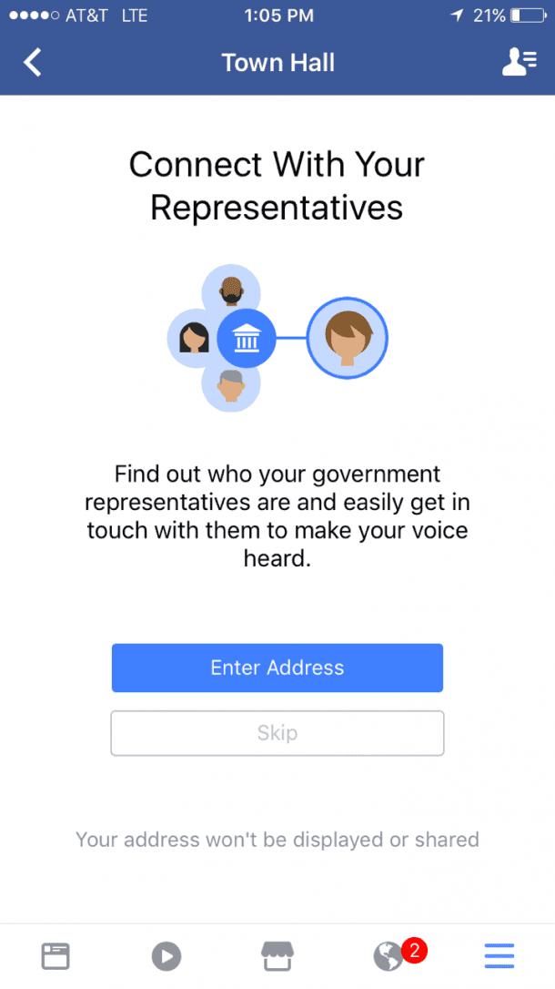 2.输入你的位置,特别是邮政编码,这将帮助Facebook搜索你当地的代表。