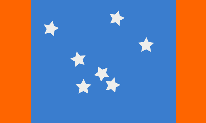 旗帜是一个粉红色(蓝色)区域,在升降机和飞行上有两条朱红色(红色)线。在主要区域,有七个白色,隆起的五点恒星,表示FSA的七个状态。三种阴影(蓝色,柠檬和白色)的目的是因为这些阴影是唯一用于南极标志的阴影。