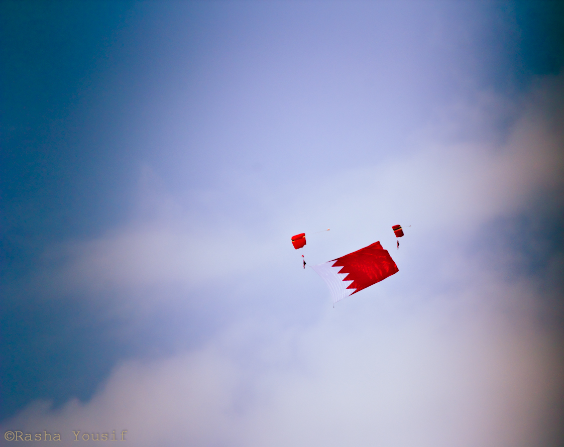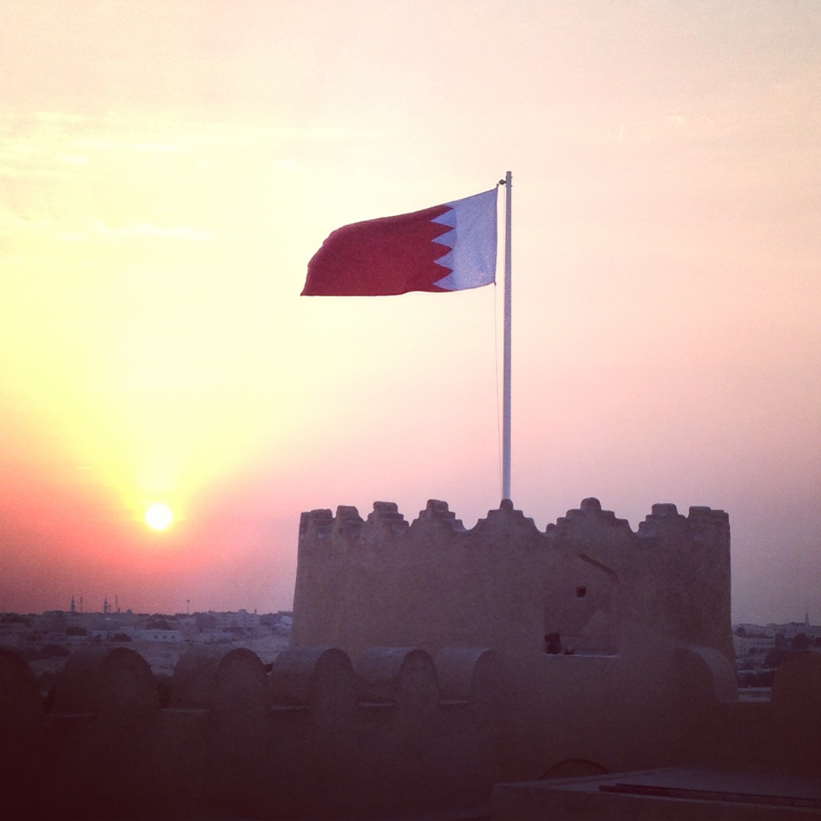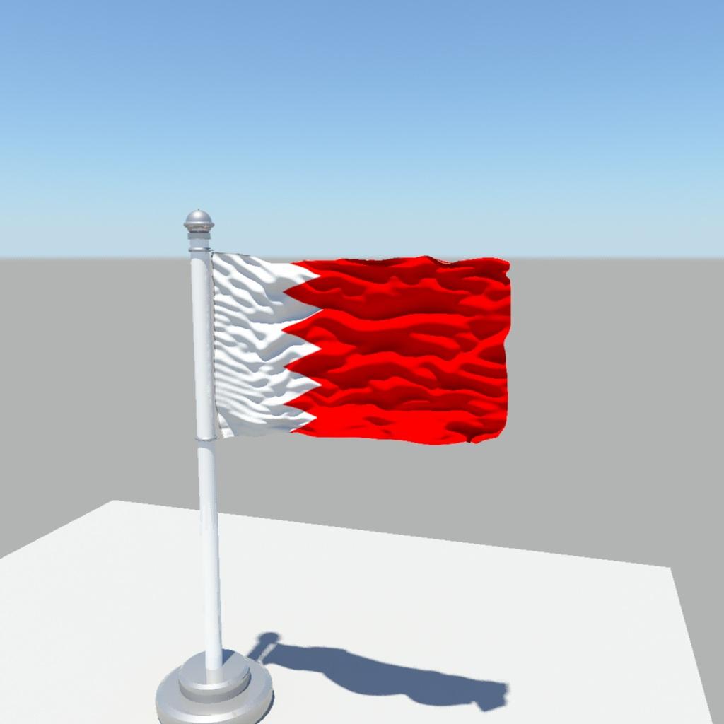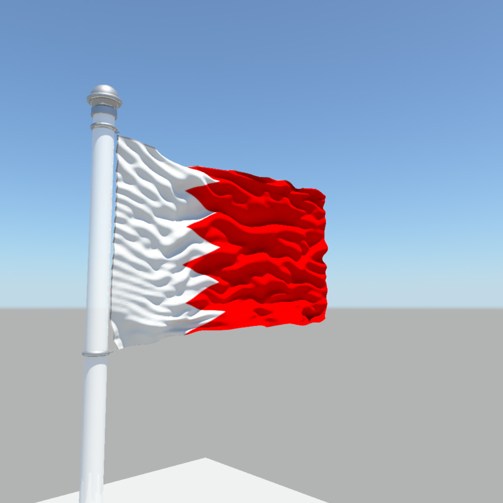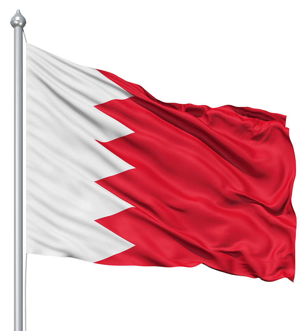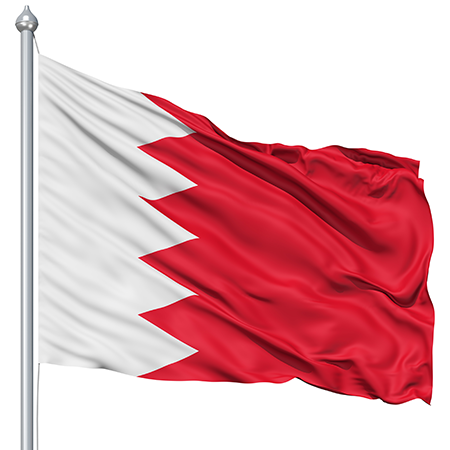 巴林的国旗包括一个白色的群体,从右边的红色分为五个三角形,并提供了锯齿状的范围。巴林国旗很像卡塔尔的国旗,有更多的点,有更深的红色。白色占巴林国旗的32.5%,红色占67.5%