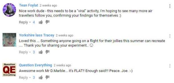 他在视频中解释了自己的实验:“我记录了23分45秒的延时,根据这些测量数据,这意味着飞机飞行了203英里多一点。根据解释球体模型的曲率数学,这应该会导致5英里的曲率补偿。你会看到,对于曲率没有可测量的补偿。要知道引力仍然只是一个理论。不要再为我们知道的事实辩护了!现在我们向敌人开战!# FEOffensive。”