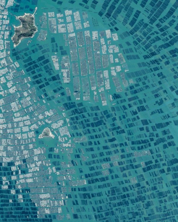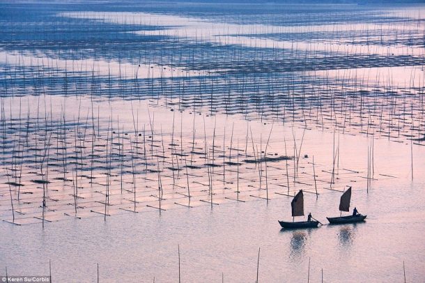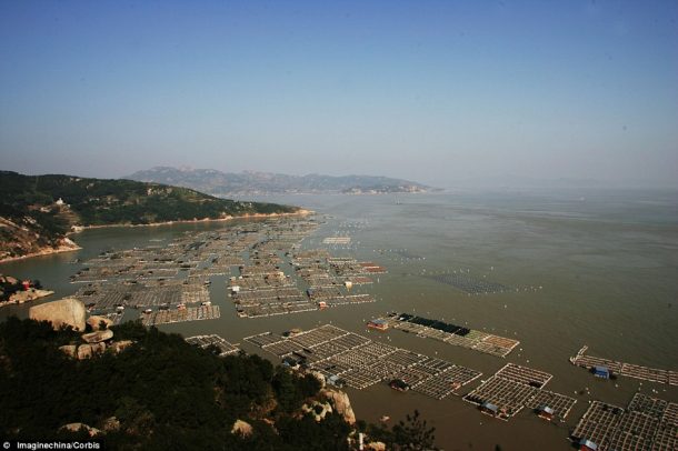 中国250亿英镑的养鱼产业在东方海,南中国海和黄海的广阔水域建立,在过去的3000年中一直是该国的主要经济来源。这些农场的木制平台和路径网络标志着这些农场。