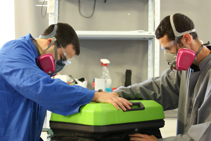 为了开始转换,用户必须用降粘(一种用于充气船的坚固的PVC材料)对行李箱壁进行充气。通货膨胀可以通过多种方式实现;人们可以使用电动泵,外部泵(包装的一部分)或利用肺部的力量通过外部管道呼吸空气。内置泵也能够放气任何真空袋,以减少包装过程中的衣服体积。