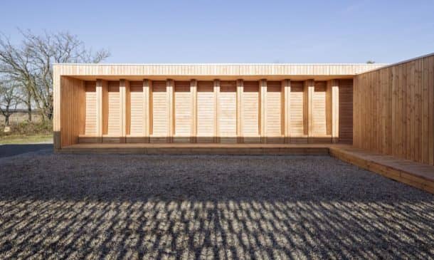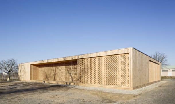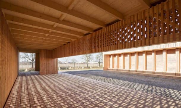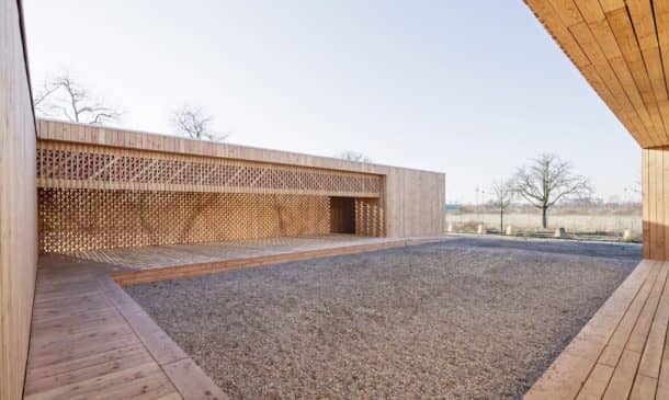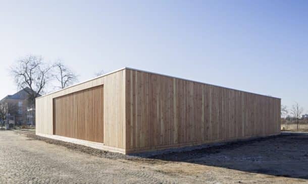 该社区中心完全由轻质未经处理的木材建造,较大的部分在前军事设施中预制,然后再组装。